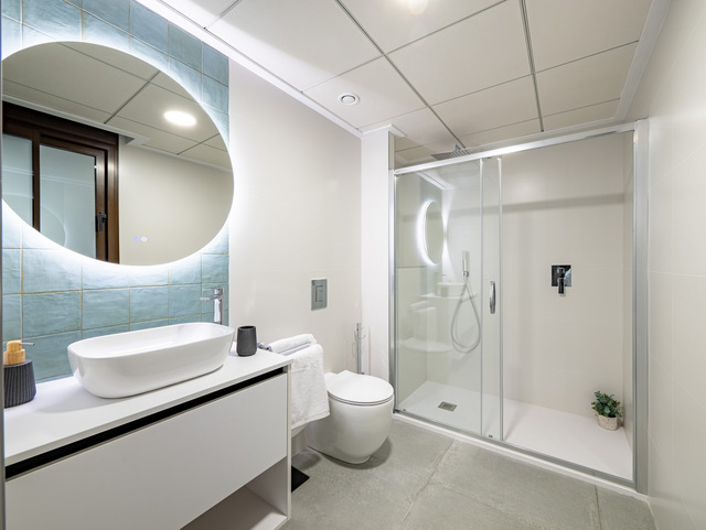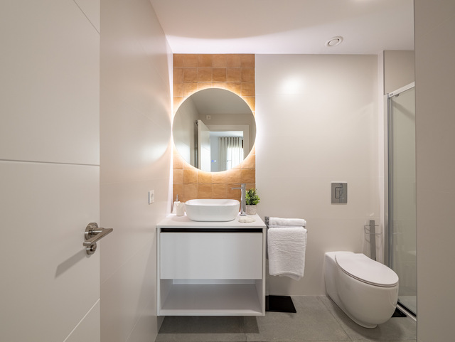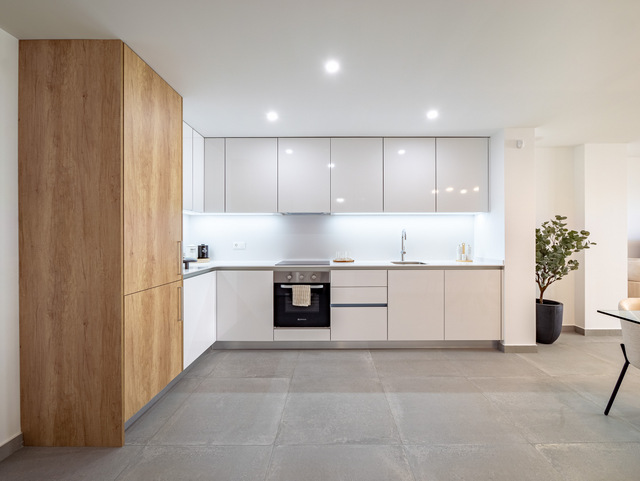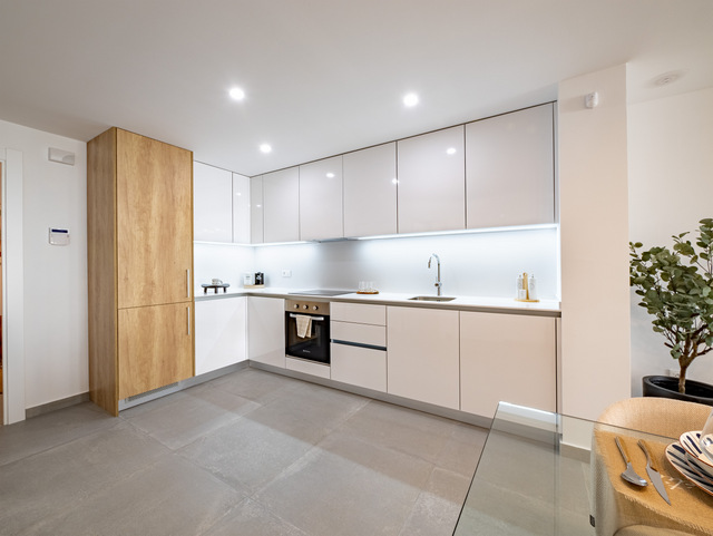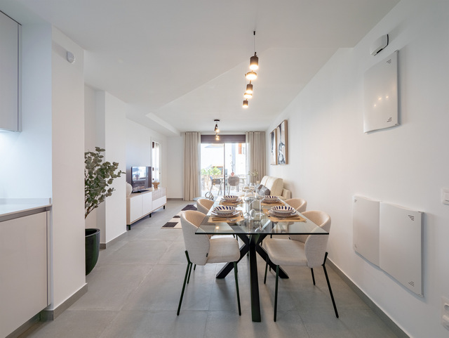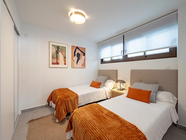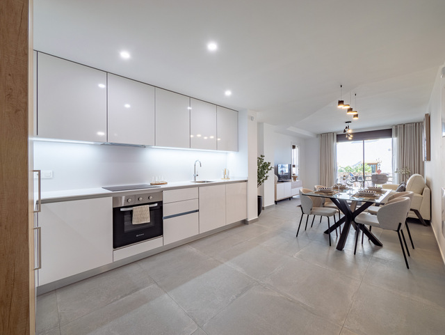 LAST UNIT new build ground floor apartment with 2 bedroom, 2 bathroom in Villamartin, Orihuela-Costa. The apartment has a total built size of 74m2, with a 8m2 terrace and a 20m2 garden. Included: Air Conditioning. White goods package. Alarm system fully installed. Interior and exterior furniture. Interior & exterior lighting. Landscaped garden. Communal pool. Kitchen Charming and practical space with a combination of natural oak and white glossy melamine furniture. Elegant worktop & backsplash Blanco Luna model. Filtering unit. Kitchen sink with high spout faucet. Bathrooms The bathrooms include general tiling white (30X60) completed with the wall Stardust Cotto y Stardust Teal (13,5 x 13,5). Porcelain floor tiles Metropol Zen Grey. In both bathrooms, mixer taps will be installed on white sinks and toilets with a current design. White resin shower tray, sliding aluminum screen and mixer taps. The white suspended bathroom unit with adjustable support in height and depth with anti-tip system. Windows and sliding doors Brown aluminum carpentry with electric blinds of the same material and colour in all rooms, tilt and turn system in bathrooms with manual shutters. The built-in wardrobes are finished with white smooth sliding doors. Completed with brown sliding windows with electric shutters of the same material and colour. The restrooms have tilt and turn windows system with manual shutters. Doors: Main entrance armoured security door fitted with exterior in brown and white interior panel. White lacquered interior doors with stainless steel square handlers. Built in wardrobes with sliding white doors and soft closing system. Domotic home system The homes are equipped with electrical and telecommunicationsoutlets required by the Low Voltage Electrotechnical Regulations. Intercom for communication between the home and the main entrance. Home automation system: blind control, alarm, lighting control (living room and kitchen). Legrand Valena Next series mechanisms that can be connected to the home automation system. Included Air Conditioning. White goods package. Alarm system fully installed. Interior and exterior furniture. Interior & exterior lighting. Landscaped garden. Communal pool.