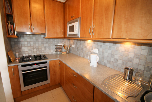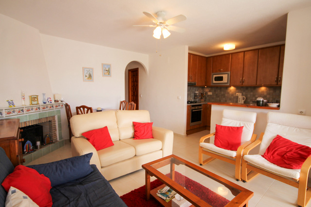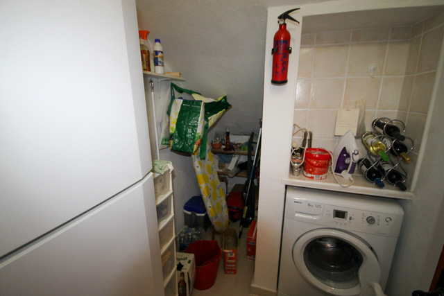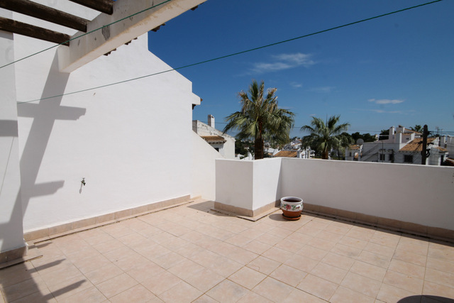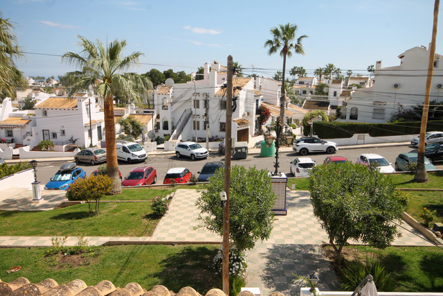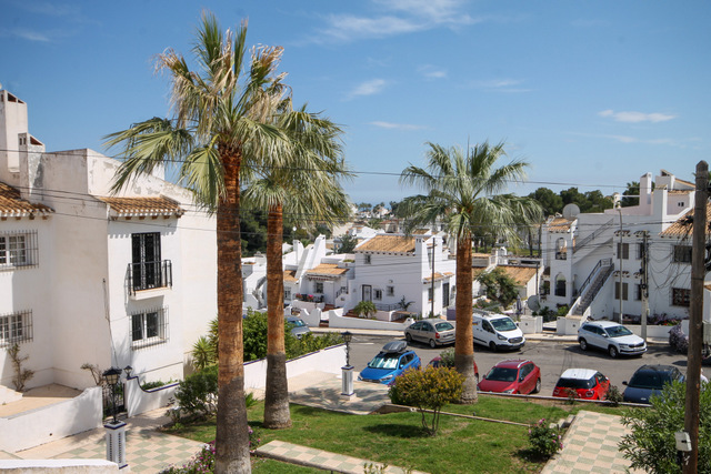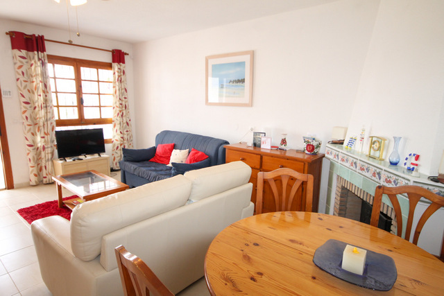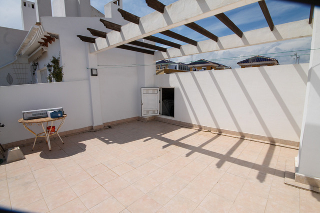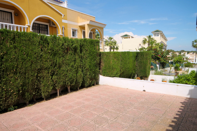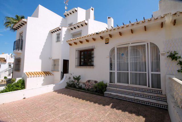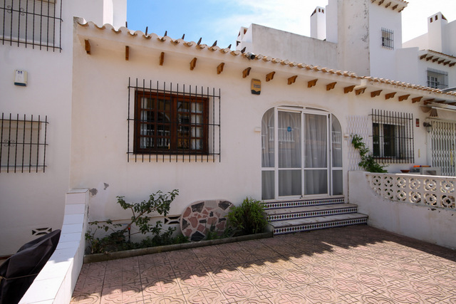 Lovely south facing mid terrace house with 2 bedroom, 1 bathroom and solarium in the very popular urbanisation of Verdemar III, Villamartin. It comprises of a sunny patio and terrace overlooking communal gardens. There is a lounge diner with open fireplace and an open plan kitchen and utility room adjacent. The hall leads to a shower room and two double bedrooms, the master having fitted wardrobes and patio doors accessing the rear patio garden. From the front terrace, stairs access the spacious roof solarium with plenty of room to relax or entertain. It has storage under the roof, and also enjoys an open aspect with distant sea views. The property also benefits from a sun awning, an alarm, ample storage and use of the stunning communal pools and communal gardens with the streams meandering through the urbanisation. Verdemar III, is walking distance to all amenities and only 10 minutes drive to the nearest beaches on the Orihuela Costa. Viewing highly recommended!