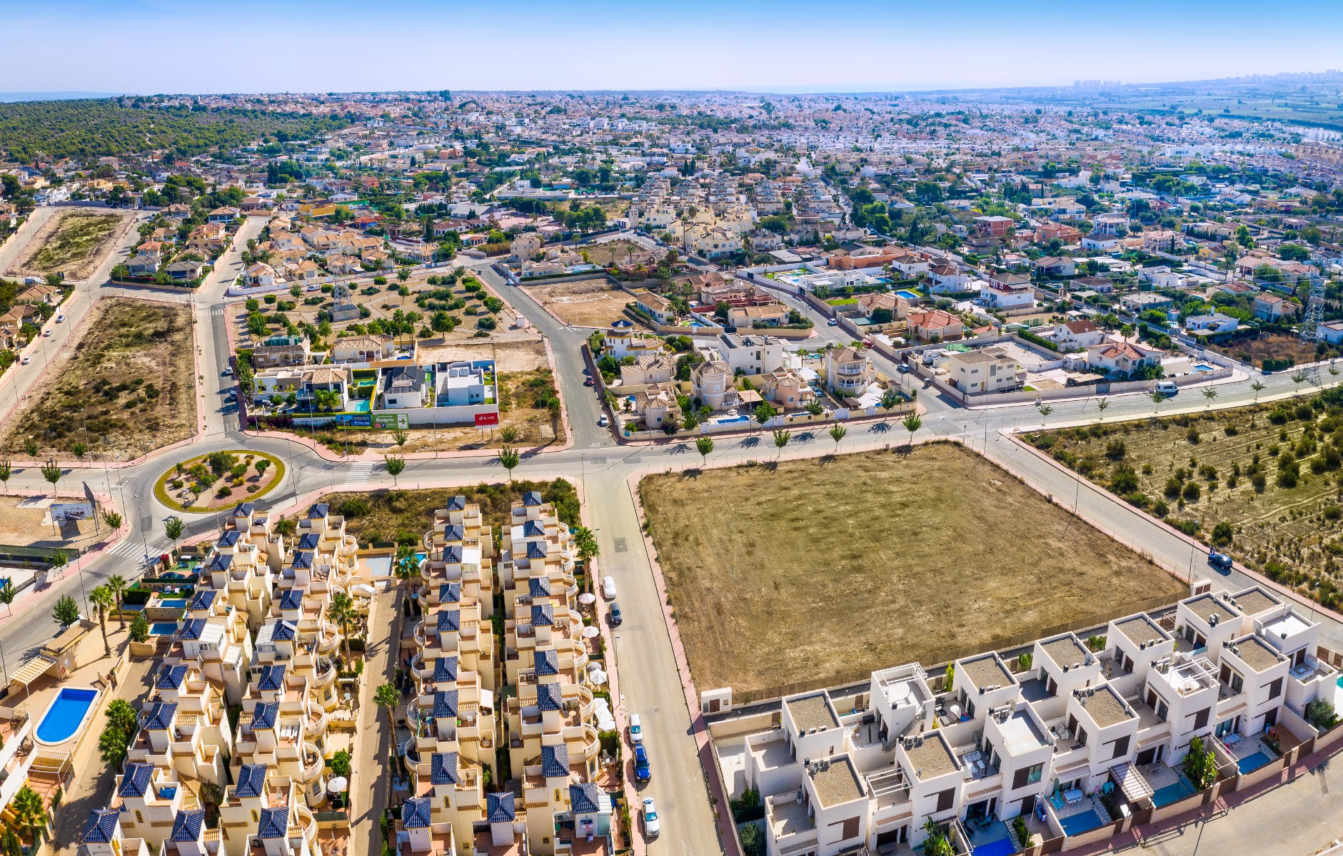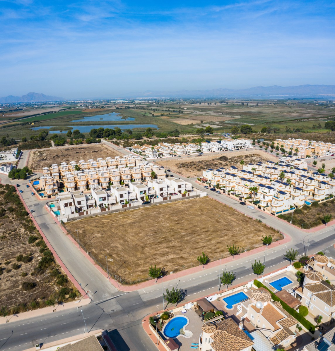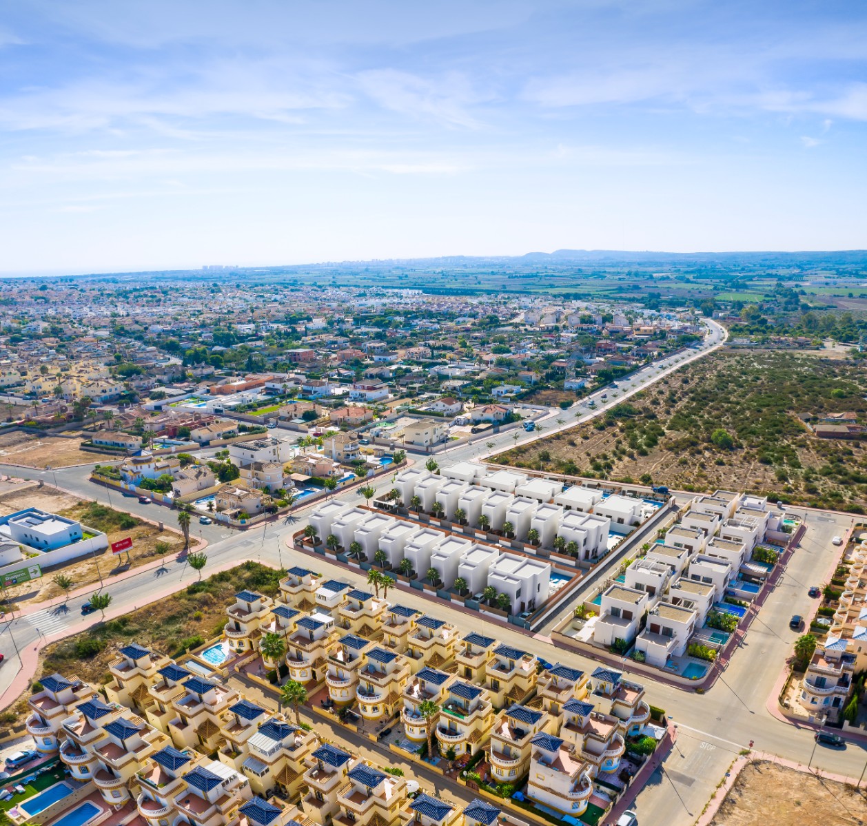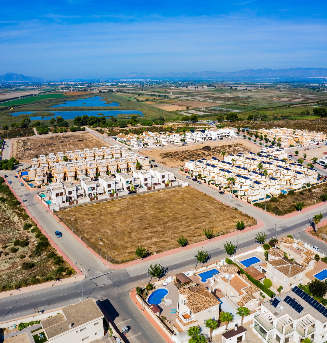 These new villas are always provided with 3 bedrooms, 2 bathrooms, furnished kitchen and a garden including parking space. Plots are available between 180- and 217 sqm with an option to add basement and solarium. Perfectly located within walking distance of shops & amenities with less than 30 minutes drive to Alicante International Airport. The residential consists of 23 ibiza style semi-detached villas in independent plots with terrace and fantastic views! Call us now for further information!